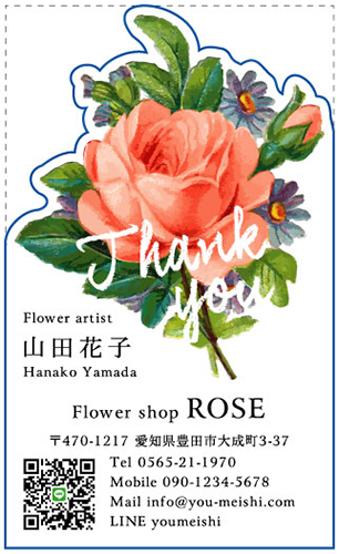 名刺の一部分を好きな形に切り抜いたり、名刺そのものの形を切り抜く事ができます。会社のロゴを切り抜いたり、ハート・星・動物・クラウン・花・果物・リボンの形の名刺…etc とデザインは無限大!